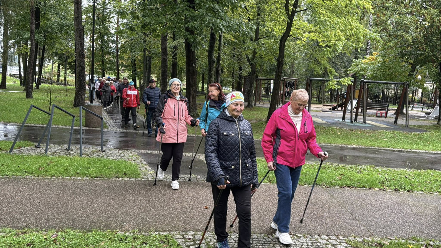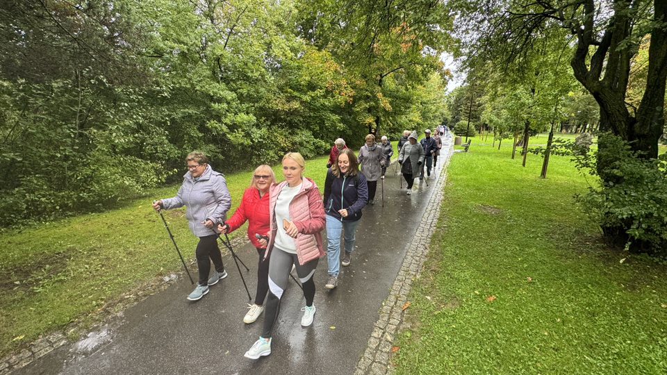 Drugiego dnia "Senioraliów" Seniorzy i wszyscy chętni aktywnie spędzaili czas w Parku Jana Izydora Sztaudyngera na Zarabiu, gdzie wspólnie spacerowali z kijkami.