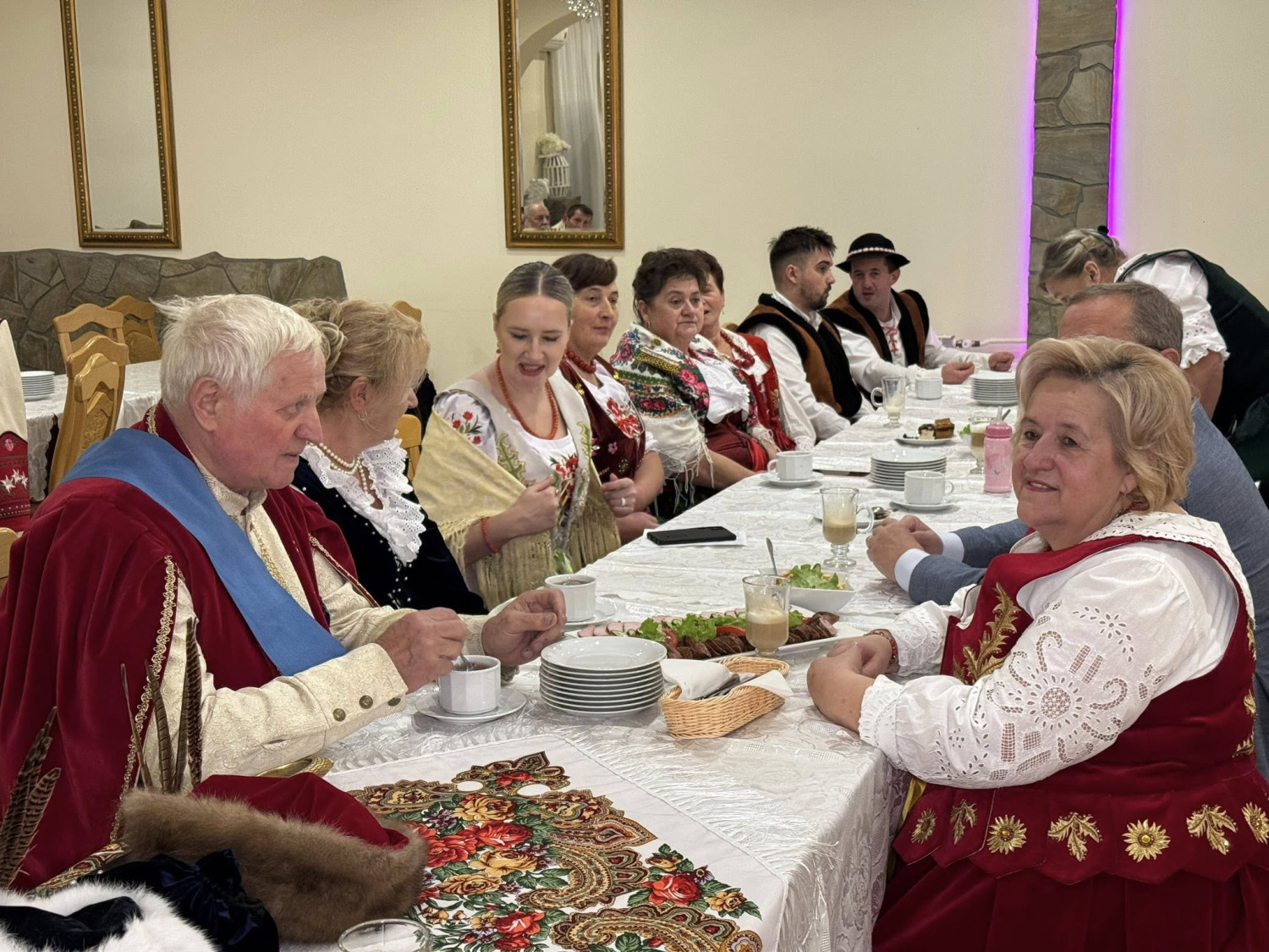 Gości powitał zapach tradycyjnych potraw, gwar rozmów i śmiech, a dźwięki góralskiej muzyki rozbrzmiewały w całej sali. O muzyczną oprawę zadbała Kapela Góralska „Cyrniawa” z Krzeczowa, która swoją energią i temperamentem porwała wszystkich do wspólnej zabawy. Nie zabrakło tańców, śpiewów i radosnych przyśpiewek, które podkreślały wyjątkowy, regionalny charakter wydarzenia.