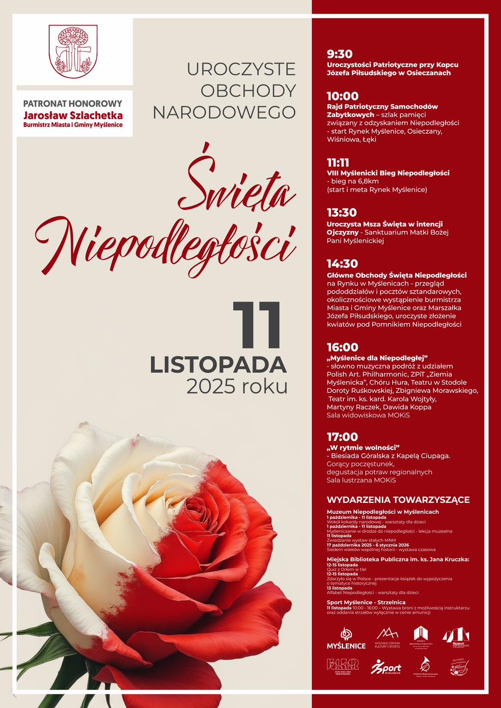 Uroczystości rozpoczną się o godz. 9:30 przy Kopcu Józefa Piłsudskiego w Osieczanach, a główne wydarzenia odbędą się na Rynku w Myślenicach od godz. 14:30. po czym przeniesiemy się do Myślenickiego Ośrodka Kultury i Sportu na część artystyczną.