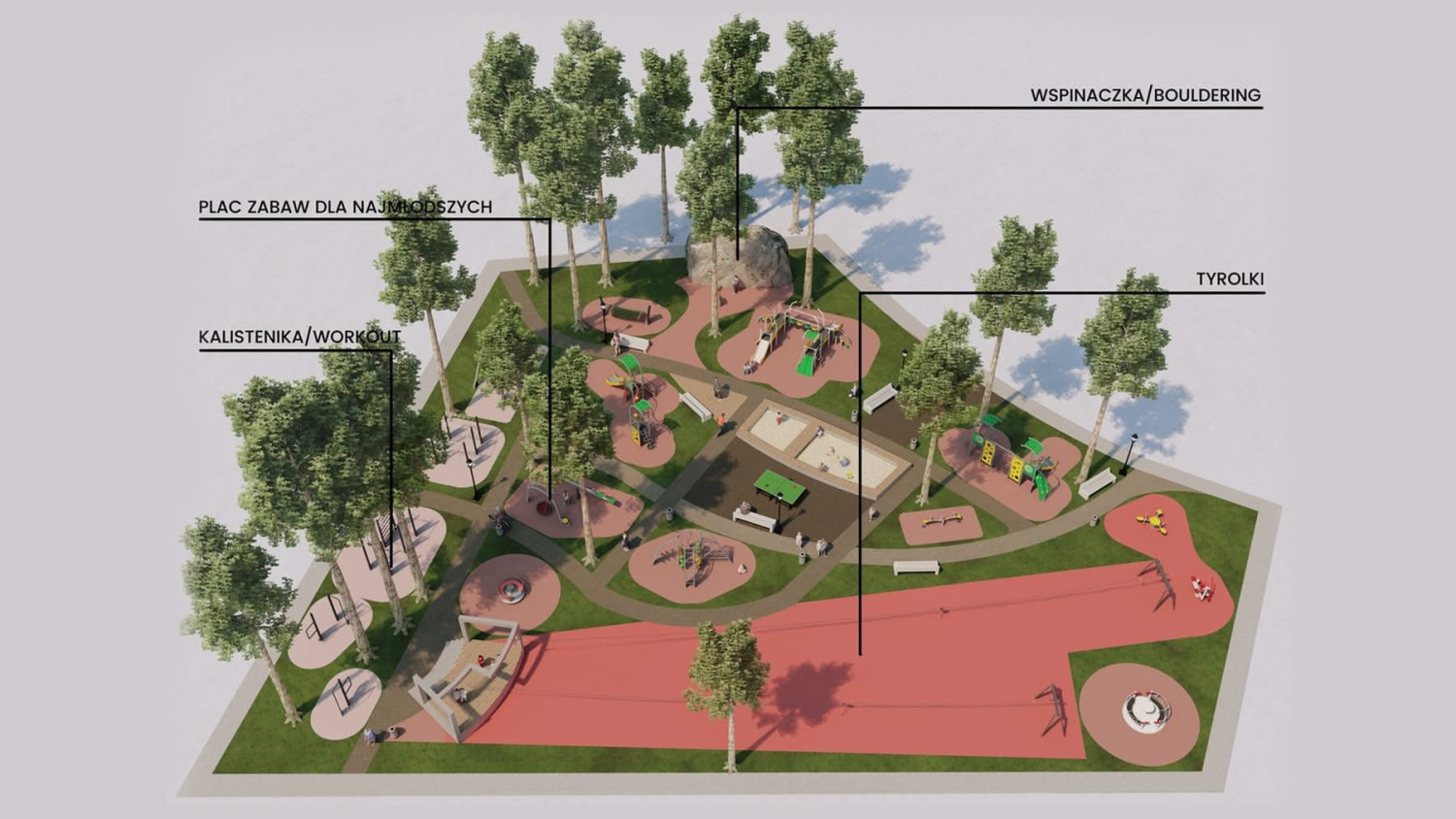 Projekt zakłada stworzenie wielofunkcyjnej strefy aktywności. W planach znalazły się m.in. elementy wspinaczkowe, strefa kalisteniki do ćwiczeń z wykorzystaniem masy ciała oraz tyrolki. Nie zabraknie także bezpiecznej przestrzeni dla najmłodszych dzieci.