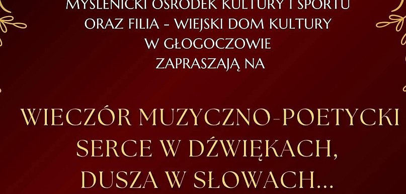 Myślenicki Ośrodek Kultury i Sportu serdecznie zaprasza na wyjątkowy koncert muzyczno-literacki zatytułowany „Serce w dźwiękach, dusza w słowach”, który odbędzie się najbliższy piątek (28 listopada 2025 r.) o godz. 18:00 w sali lustrzanej Myślenickiego Ośrodka Kultury i Sportu.